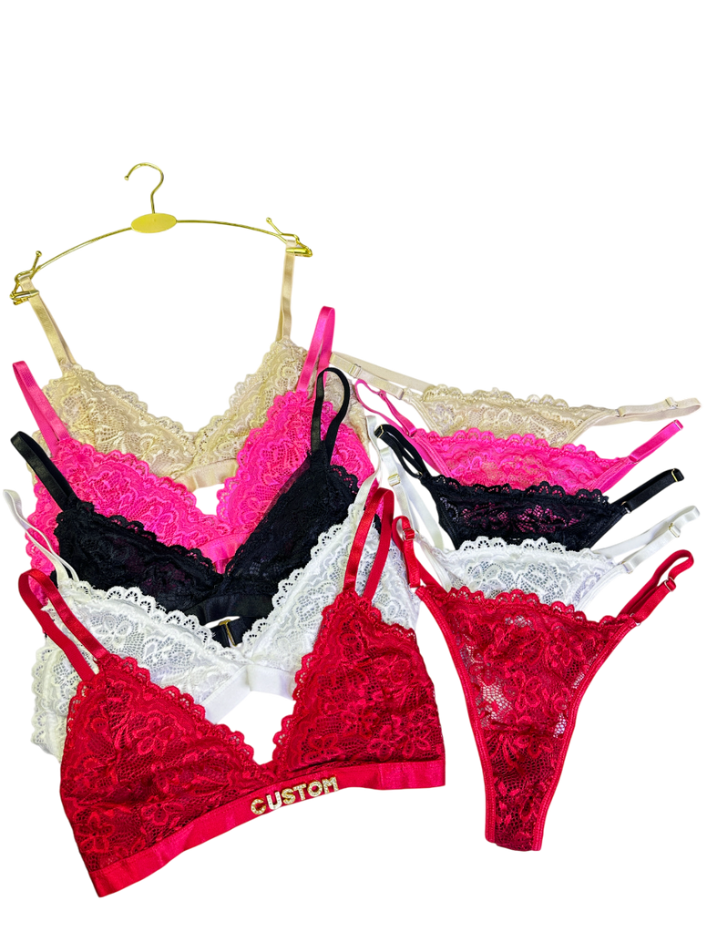 Turn your lingerie into something truly unique. Our handcrafted lace bralette and panty sets can be personalised with your name or any custom text. Perfect for special occasions, gifting, or feeling fabulous.